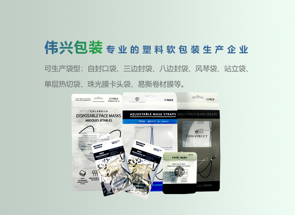 将印刷、复合、分切好的材料制成多种不同袋型的袋子:八边封袋、背封袋、拉链站立袋、三边封袋、珠光膜卡头袋、自封口拉链袋。